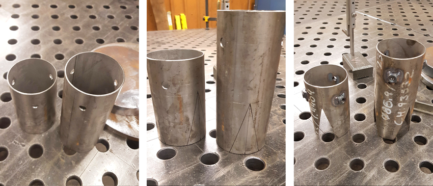Jag skar ut tre tårtbitar ur varje rör för att vattnet ska kunna nå granen så fort man häller vatten i hinken. Sedan borrade jag tre st 11mm hål lite längre upp på varje rör. Svetsade dit en M10 mutter över varje hål och skruvade i en M10 bult med bultskallen inåt. I den andra änden av bulten svetsade jag fast ett ”handtag” för att ha något att hålla i när granen ska skruvas på plats.