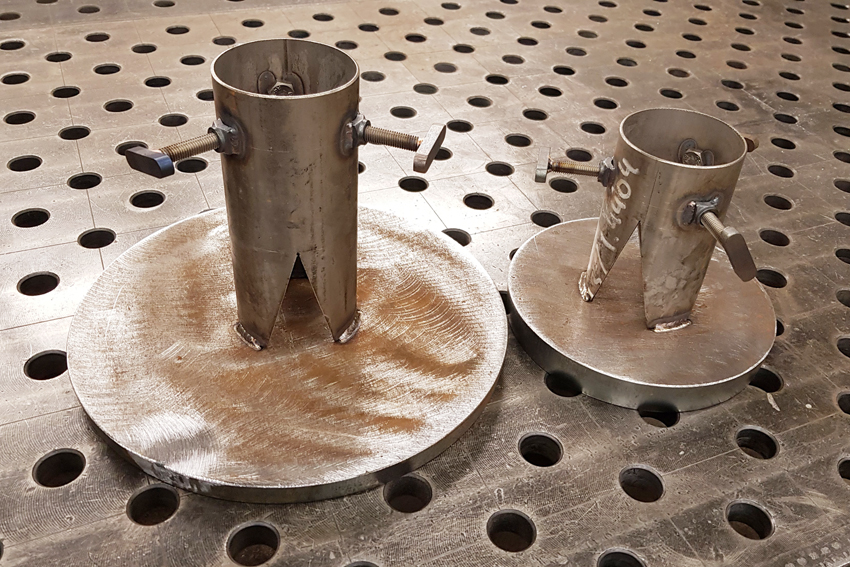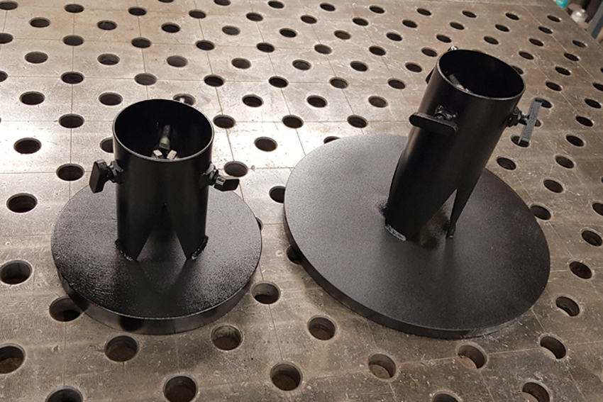 Därefter svetsade jag fast röret på den runda plåten. Nu var julgransfoten klar och jag avslutade med att lägga ett par lager svart sprayfärg.