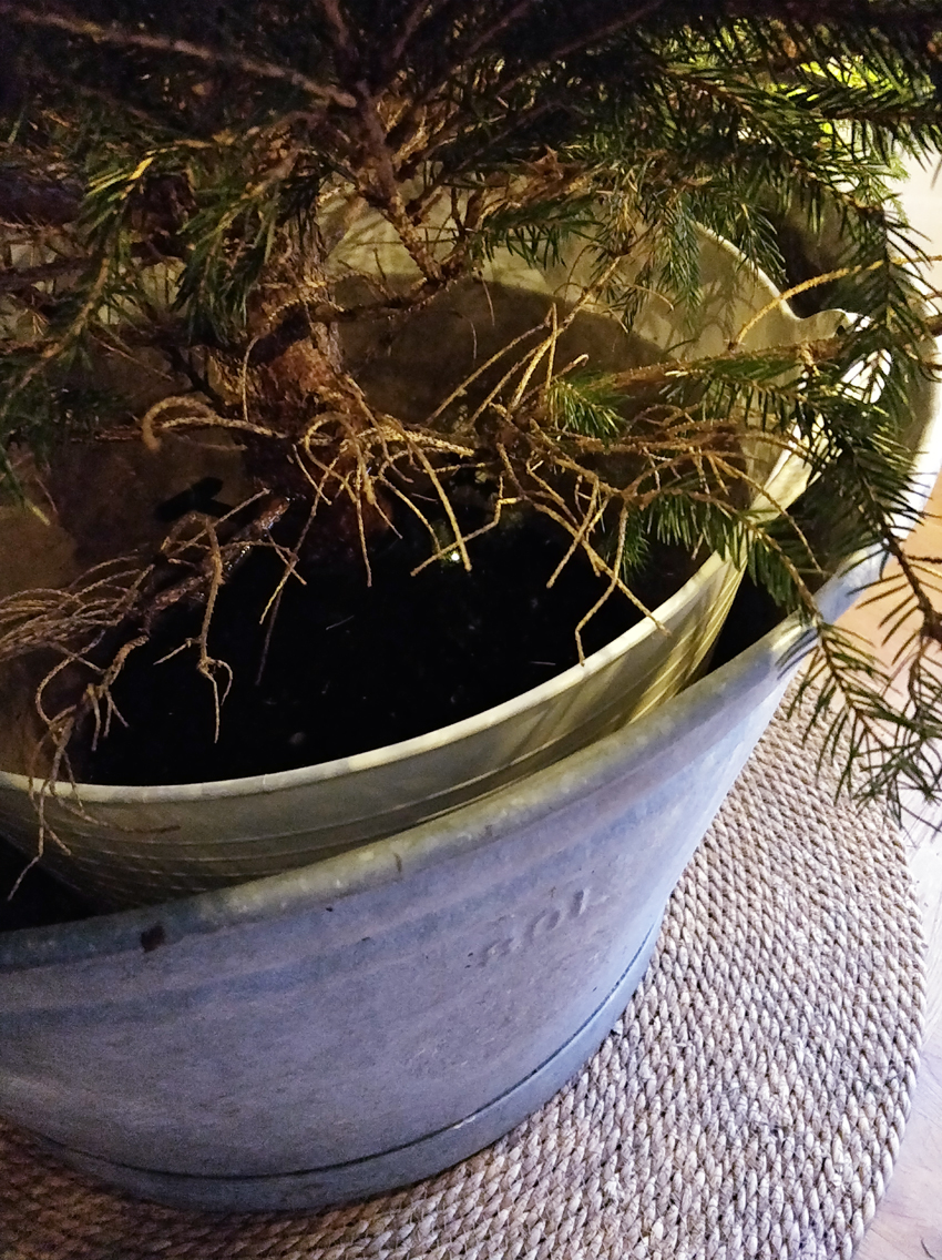 Tyvärr visade det sig att vi inte kunde använda kopparbaljan som vi hade tänkt ha till vår gran. Den höll inte tätt. Vi fick ta en stor kruka i plast i stället. Den får duga i år så skaffar vi en bättre till nästa år istället. Den fyller i alla fall sin funktion och rymmer utan problem nästan 10 liter vatten.
