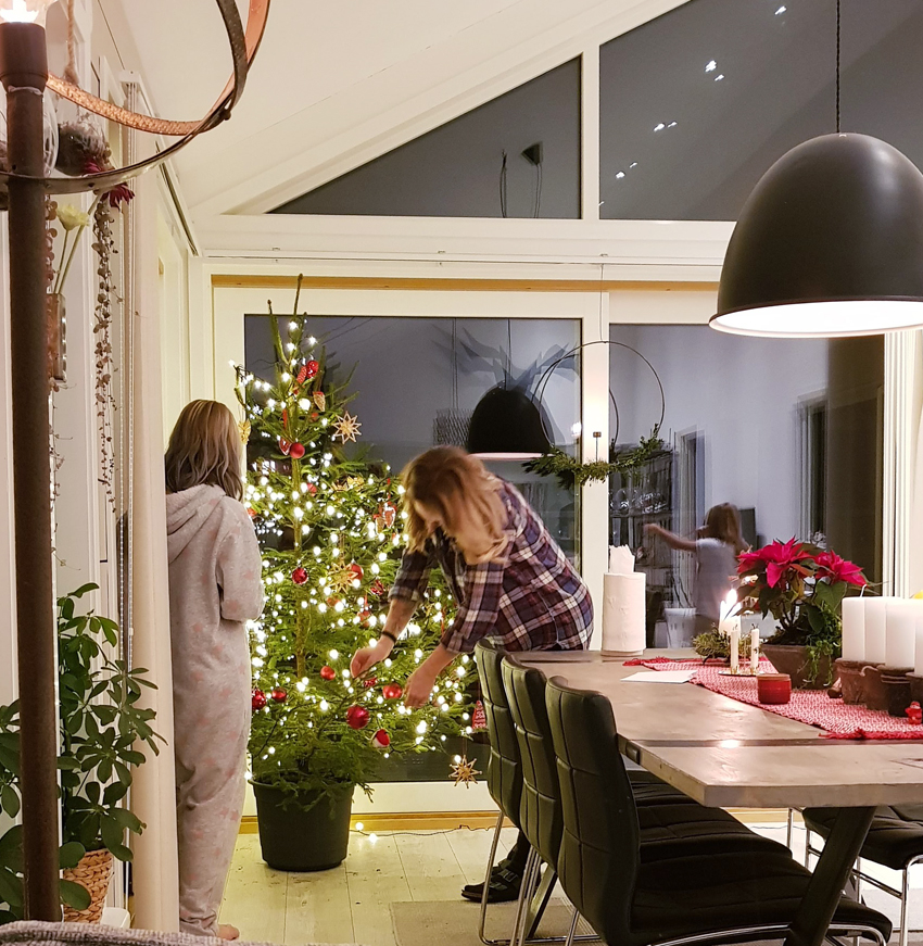 Hemma väntade Tess och ungarna förväntansfullt på att få sätta tänderna i arbetet med att pimpa årets gran.