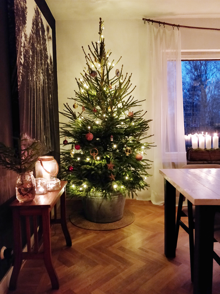Nu låter jag bitter men jag skojar, jag tycker att det är jättemysigt när granen kommer in och lyser upp huset. Den bidrar verkligen till att julstämningen infinner sig. Det enda som egentligen är tråkigt med granen förutom att den barrar är att den måste vattnas. Hela tiden.